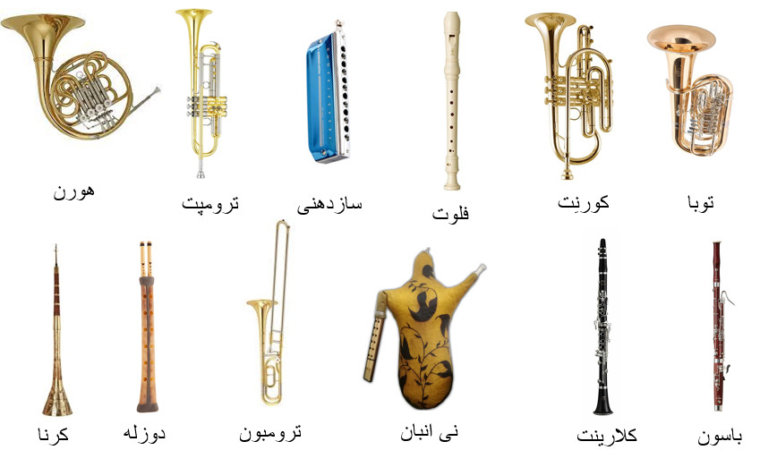 - سازهای بادی چوبی (ساکسوفون، فلوت ریکوردر، فلوت، ابوا، کلارینت، فاگوت)